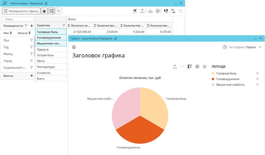 На графике Пироги (или Круговая диаграмма) каждый факт представлен в виде отдельного пирога, а каждый элемент размерности в виде сектора пирога. Такой тип графика показывает, какой процент от общего значения для всей группы данных составляет тот или иной элемент данных по выбранному показателю.