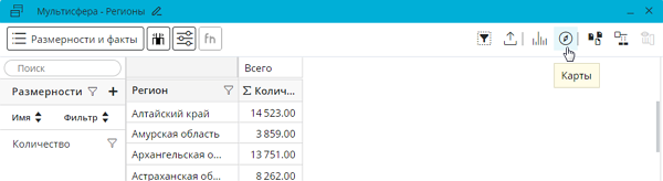 Карты также поддерживают вывод данных «на лету»: при внесении изменений в мультисферу (фильтр, выделение элементов размерностей и фактов, снятие с них выделения) вся информация на картах обновляется автоматически.