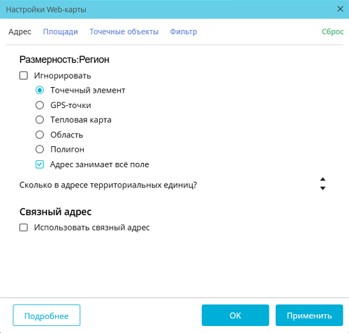Режим вывода в виде областей может быть недоступен для большинства точечных объектов, так как рекомендуется к использованию преимущественно для объектов административно-территориального деления, например, краев, областей, районов. Тем не менее, данный режим может быть доступен для некоторых точечных объектов с фиксированными границами, если соответствующие географические данные есть в используемой для карты базе данных.