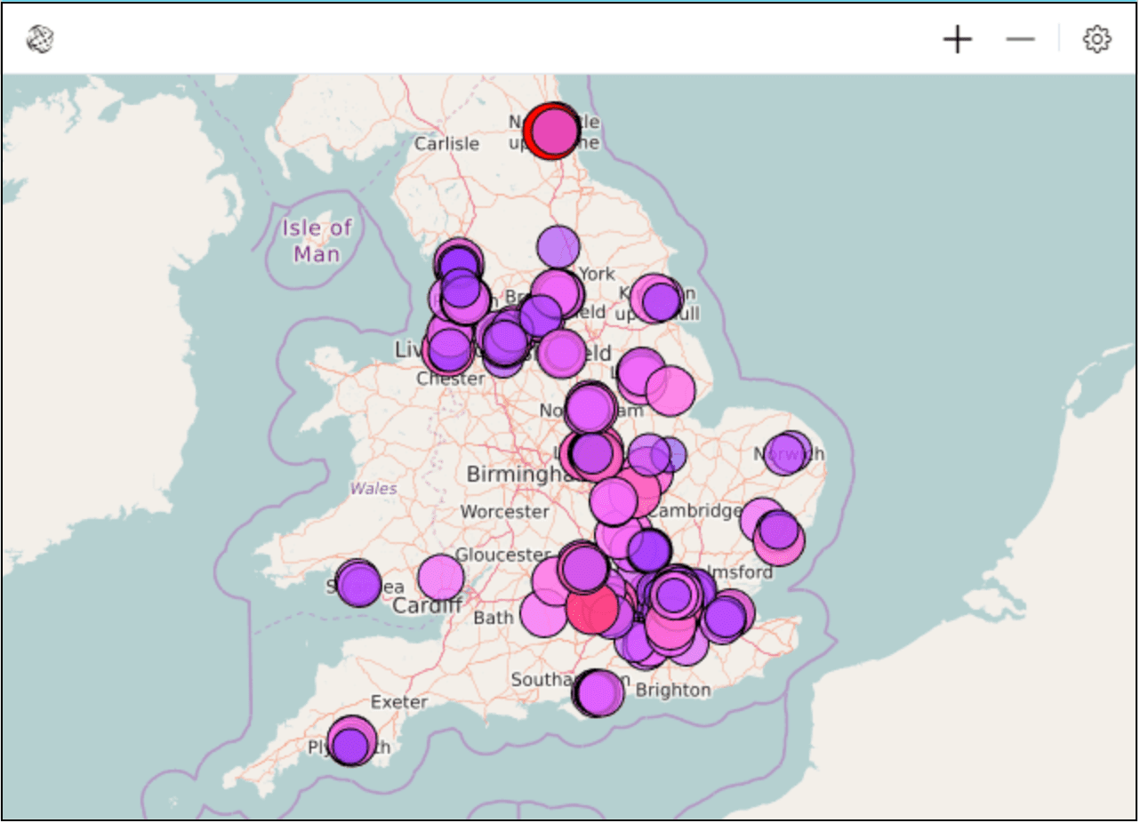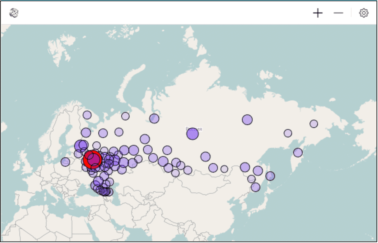 GPS-точки — строится по координатам и выводит на карту точки. Позволяет выводить значения от одного до трех фактов за счет цвета, размера и прозрачности кругов.