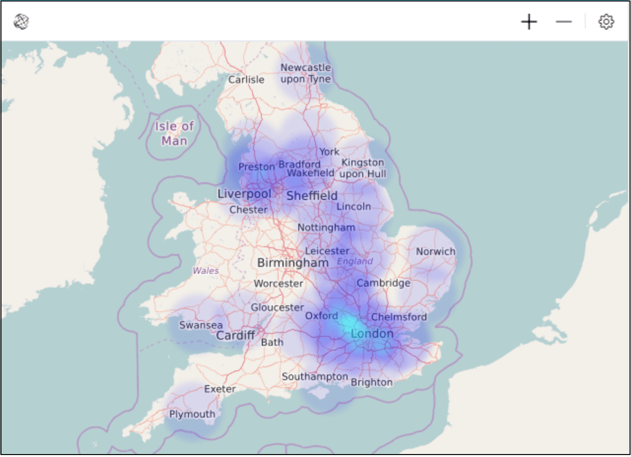 Карта по GPS-точкамТепловая карта — строится по координатам объектов и выводит значения факта за счет интенсивности цвета.