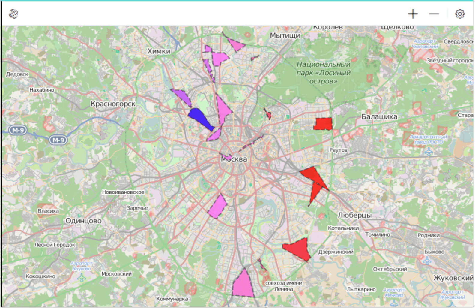 Модуль Карты позволяет вывести данные элементов размерностей на интерактивную географическую карту.