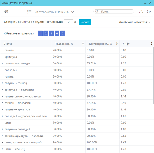 - Один объект в правилах – для одного объекта рассчитывается только поддержка. В столбцах «Достоверность, %» и «Лифт» отображаются нулевые значения.