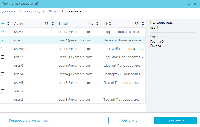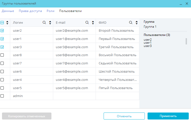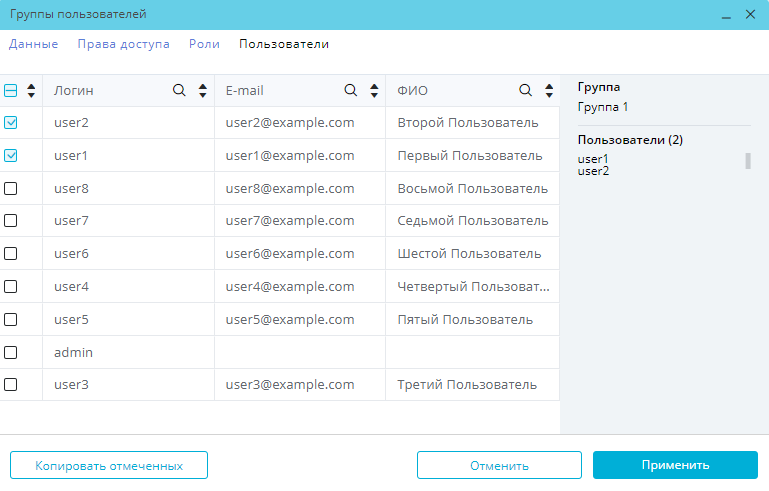 Чтобы копировать список пользователей, включенных в группу, в буфер обмена, кликните кнопку «Копировать отмеченных». По клику кнопки в буфер копируются данные вида
