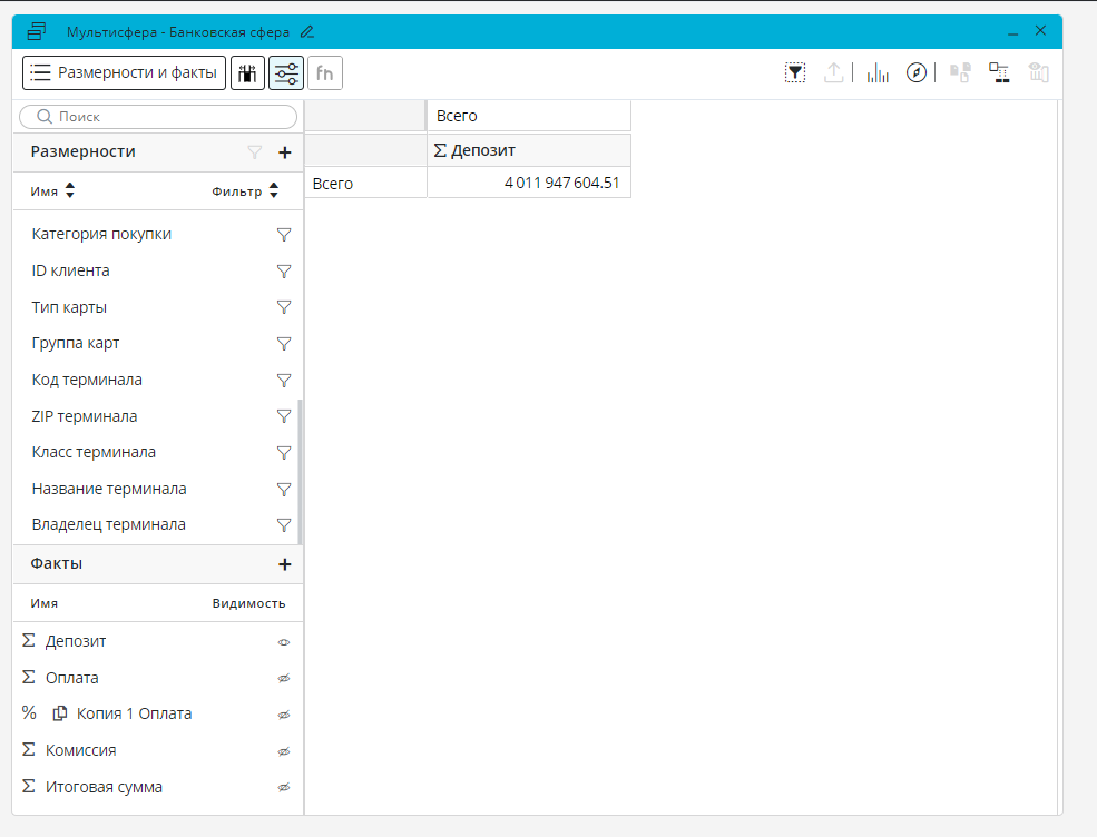 2. Все действия с фактами (создание копий фактов, изменение вида фактов) необходимо выполнить на панели «Размерности и факты» ДО того, как сделать эти факты видимыми в рабочей области мультисферы.