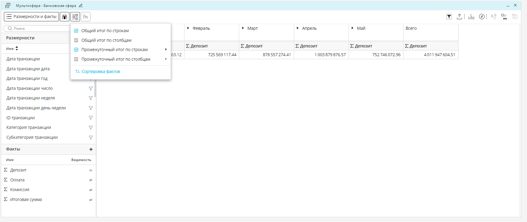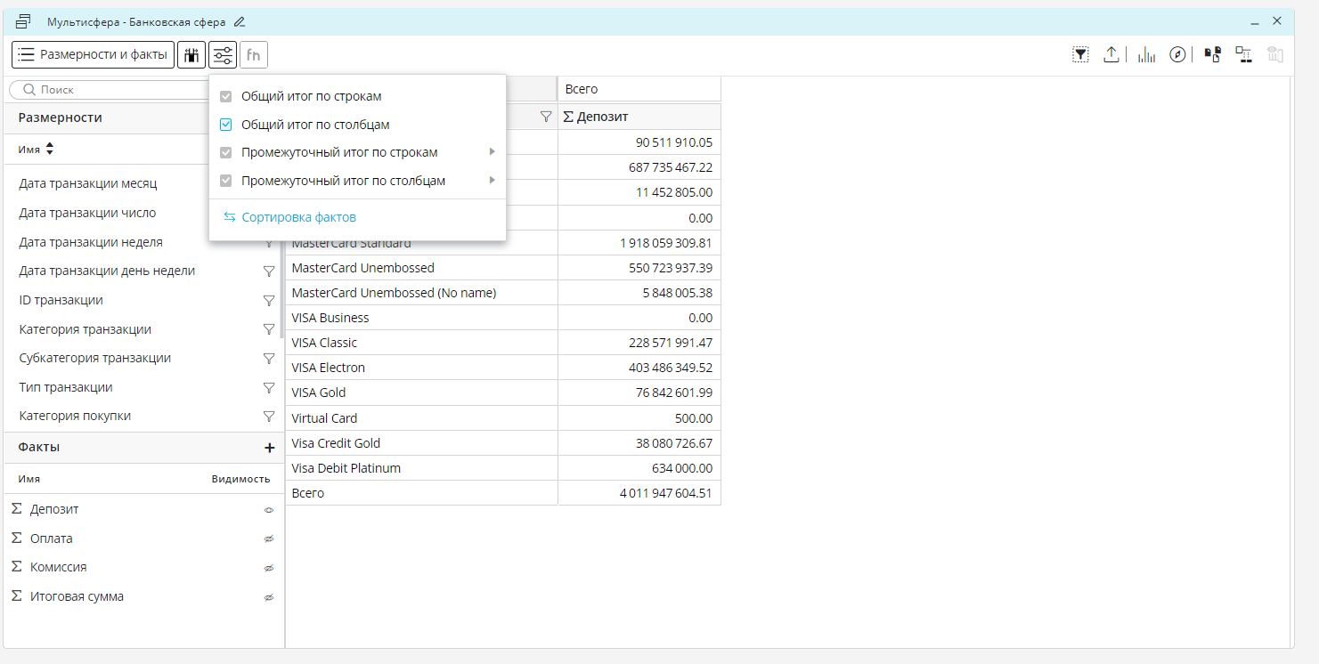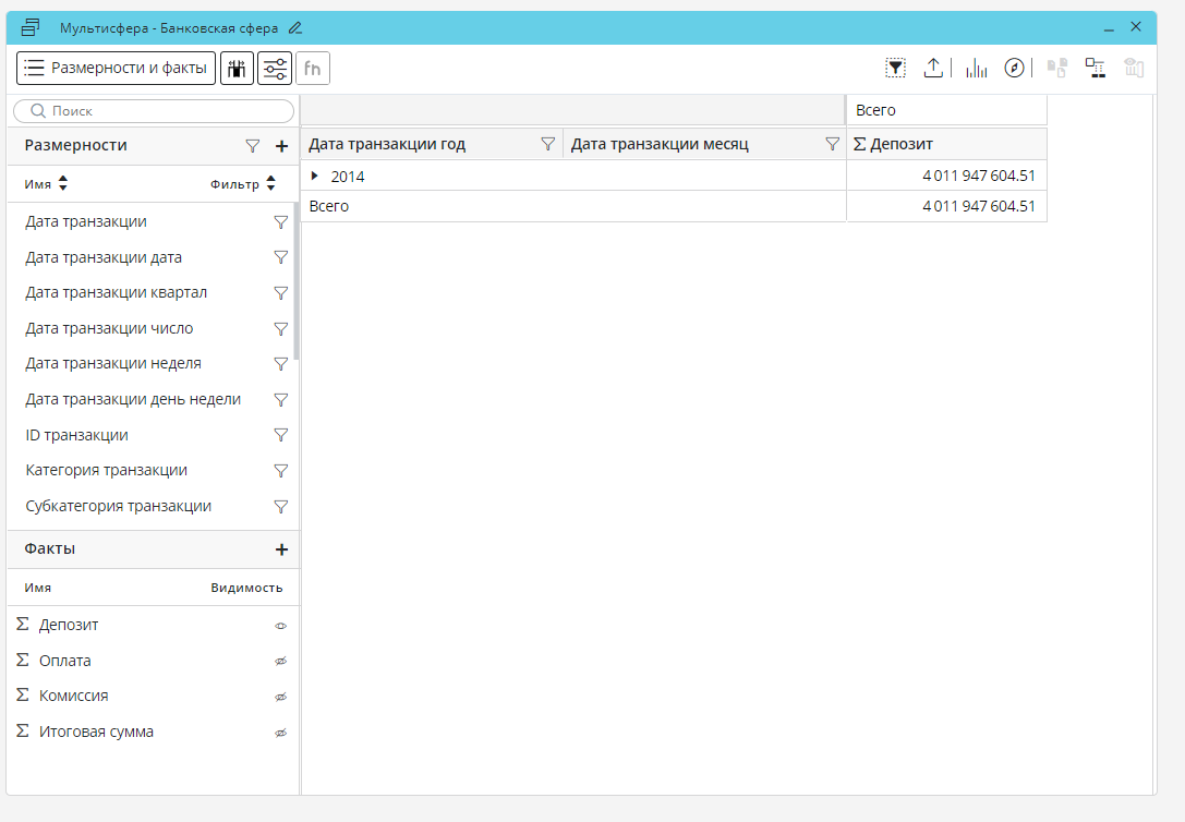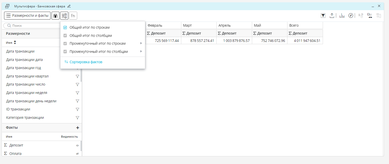 Если требуется раскрыть все элементы размерностей, необходимо перейти к размерности «Дата транзакции месяц», правой кнопкой мыши вызвать контекстное меню размерности и нажать «Развернуть всё».