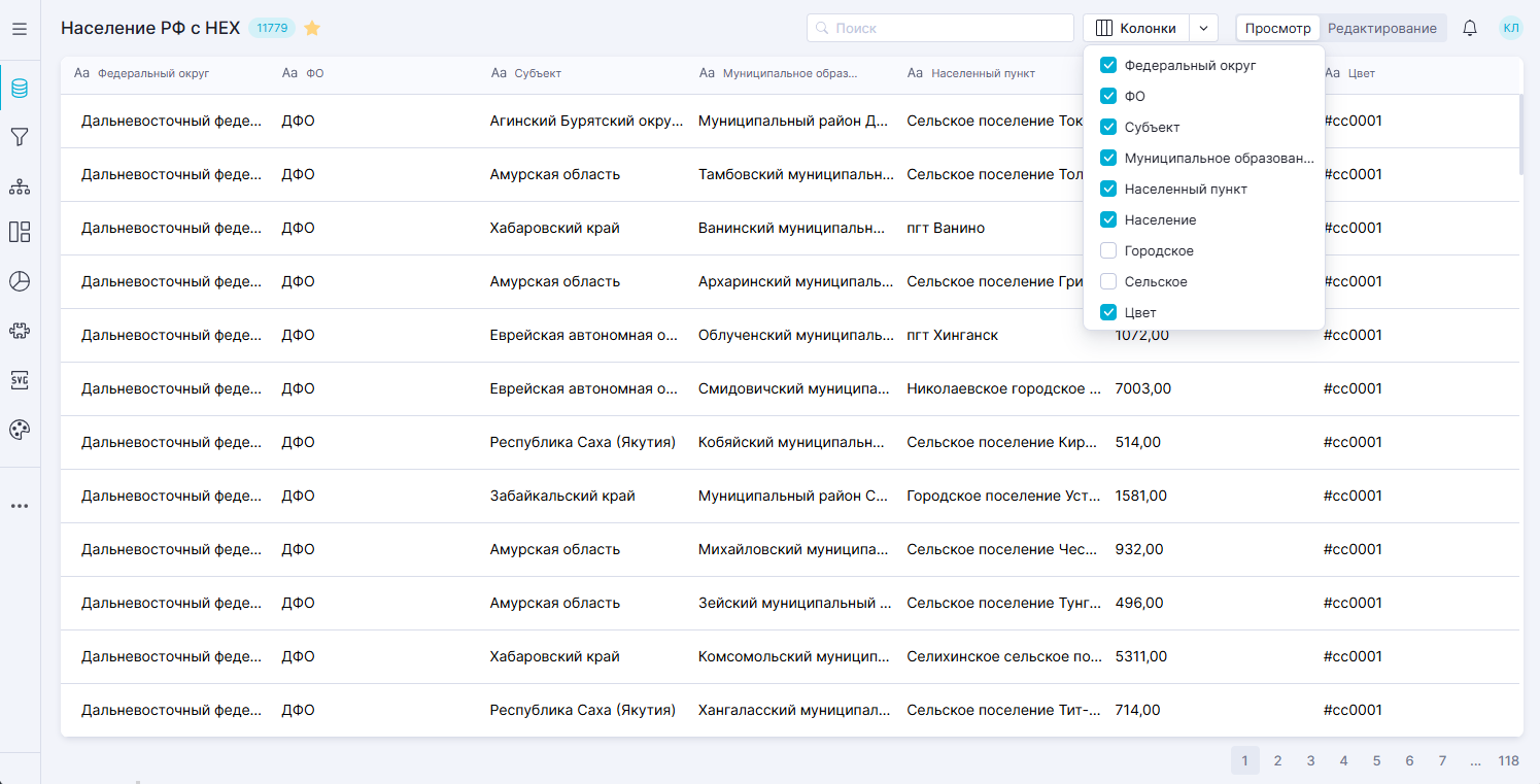 Выпадающее меню «Колонки» позволяет скрыть часть колонок датасета от просмотра, сняв чек-боксы с их названием.