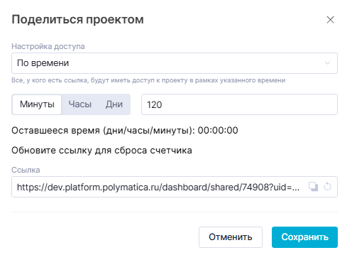 В окне настроек предоставления доступа к проекту при выбранном типе предоставления доступа «По времени» отображается счетчик, указывающий оставшееся время действия ссылки для предоставления доступа к проекту. Для обновления срока действия ссылки необходимо нажать на кнопку , расположенную в поле со ссылкой для предоставления доступа.