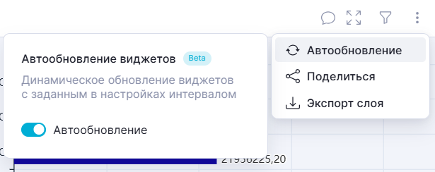 Для того чтобы включить автоматическое обновление данных виджетов при текущем просмотре необходимо в режиме просмотра проекта нажать на панели действий кнопку → "Автообновление":