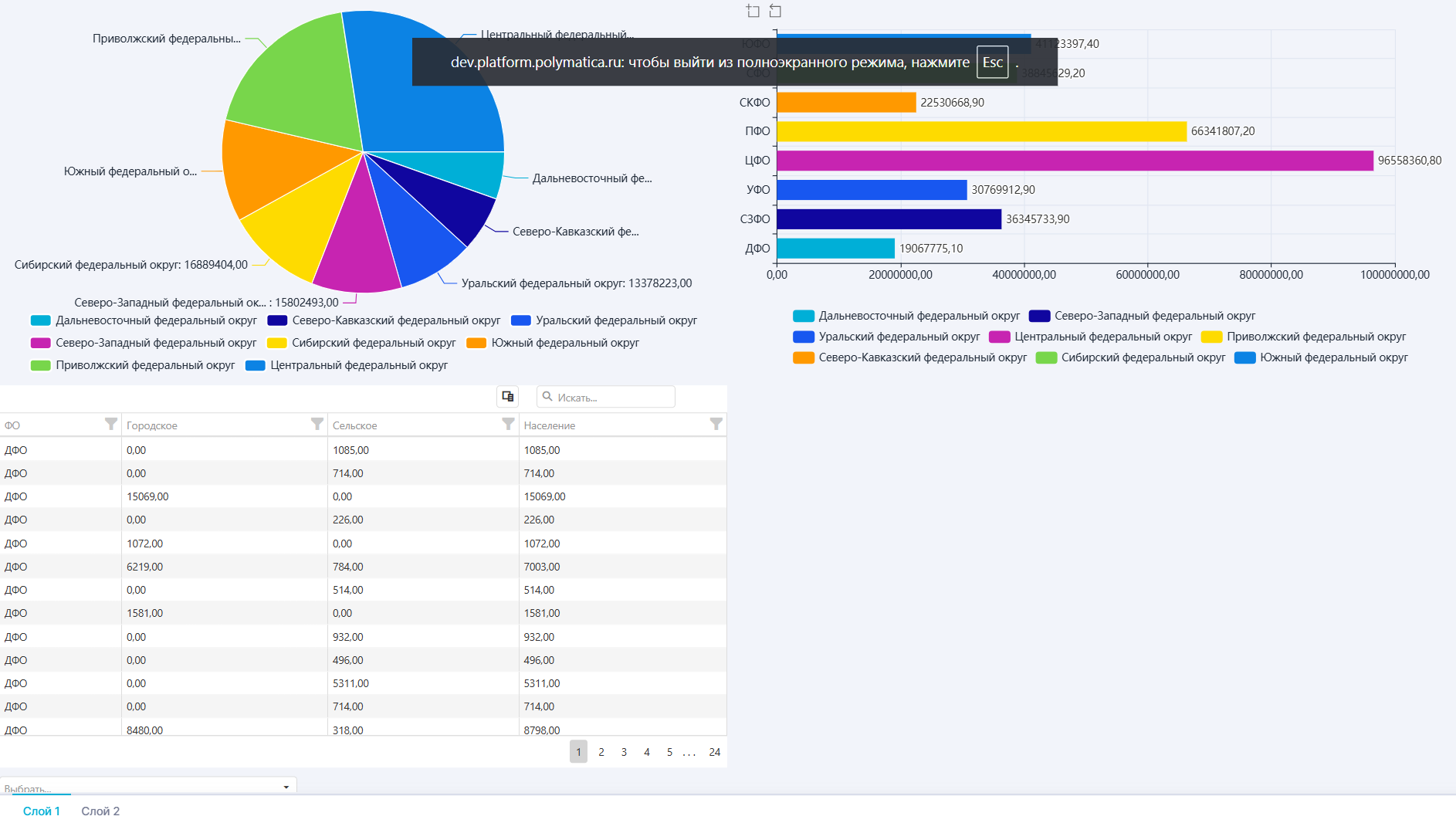 Полноэкранный режим сохраняется при детализации Drill-down, а также при переходе по ссылке компонента проекта «Ссылка» на слой любого проекта в пределах одного экземпляра приложения.