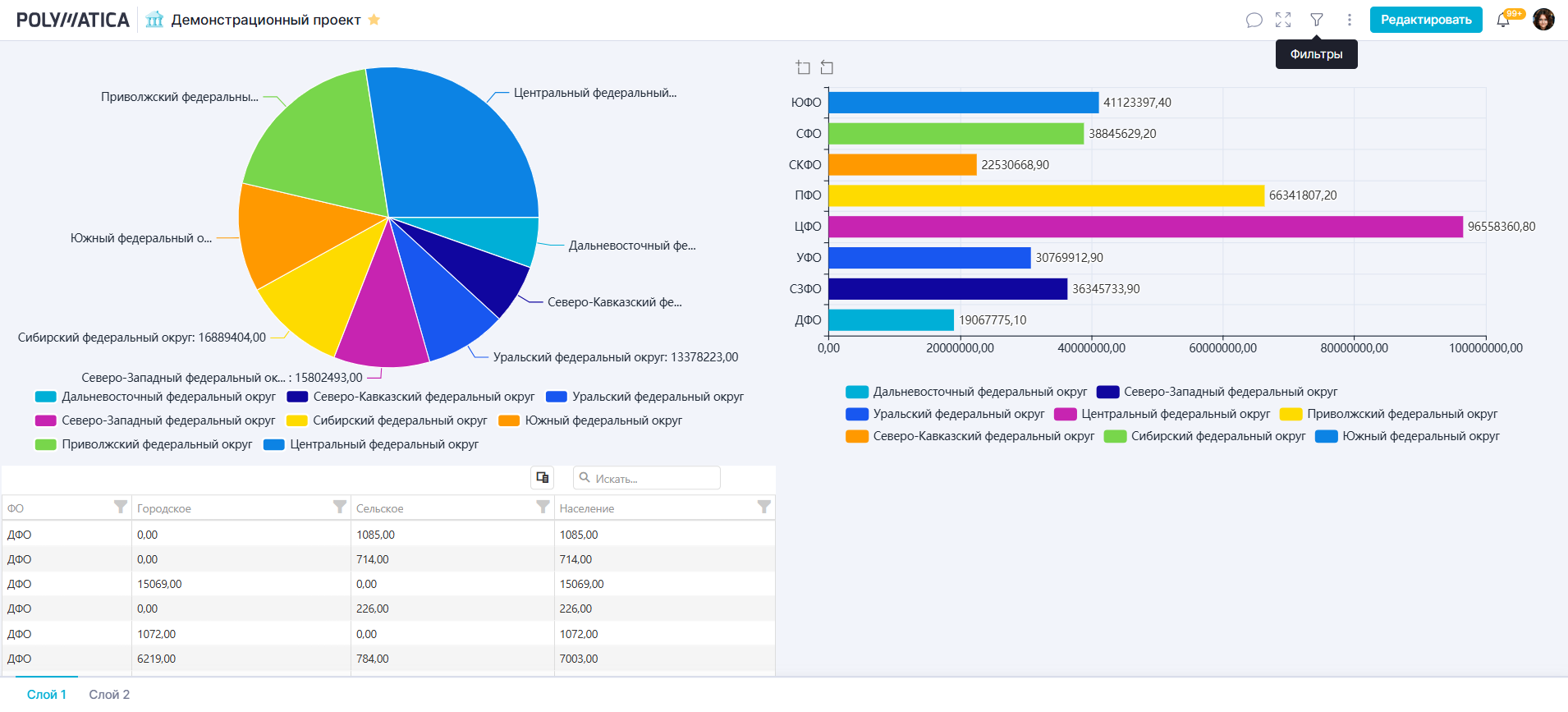 Если в проекте применена интерактивная фильтрация, все использованные фильтры можно просмотреть по кнопке " Фильтры" в панели действий: