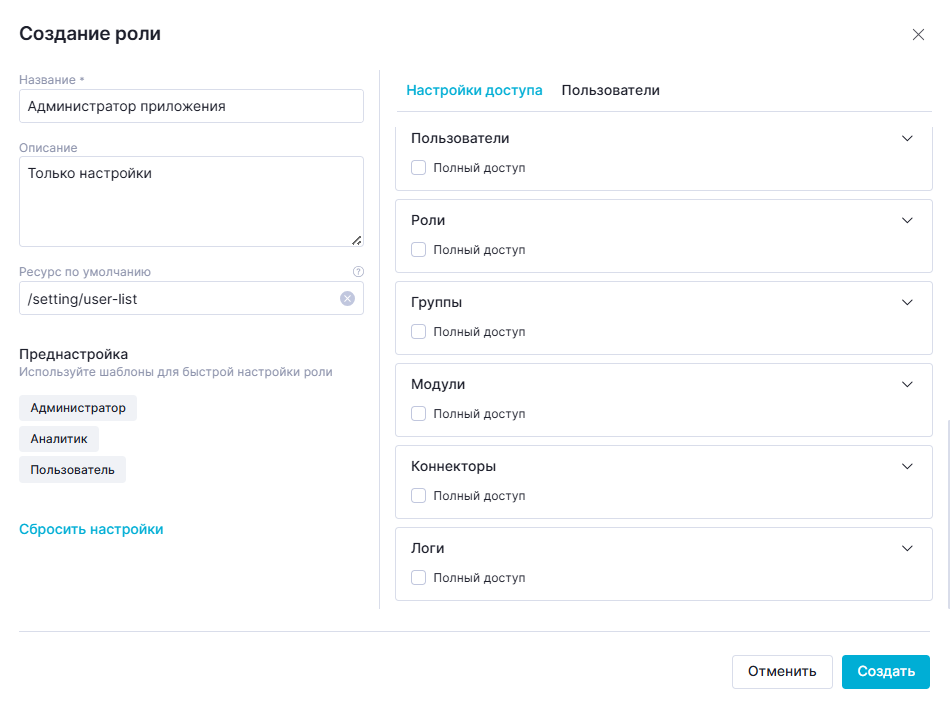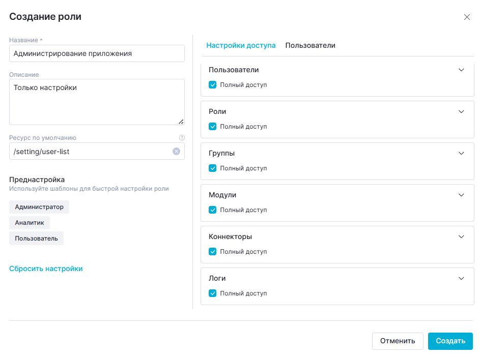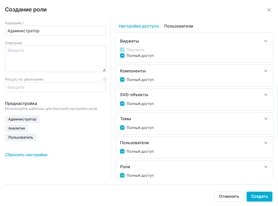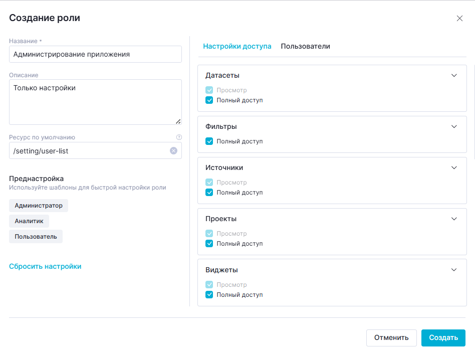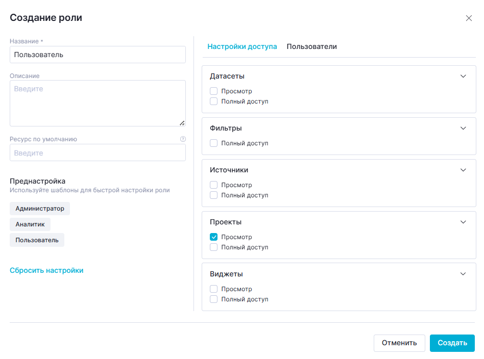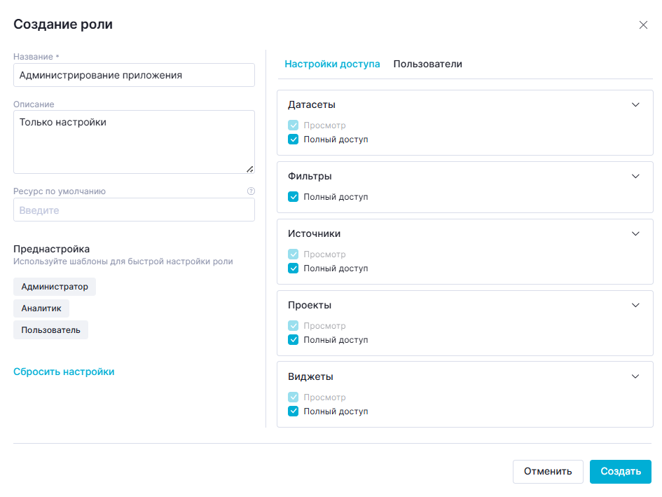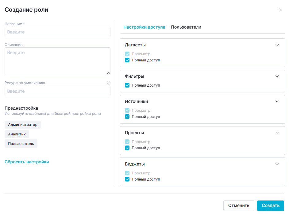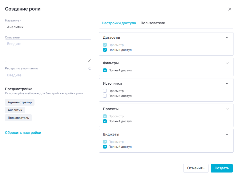 Данная преднастройка устанавливает "Полный доступ" к разделам, необходимым для создания визуализаций: "Датасеты", "Фильтры", "Проекты", "Виджеты".