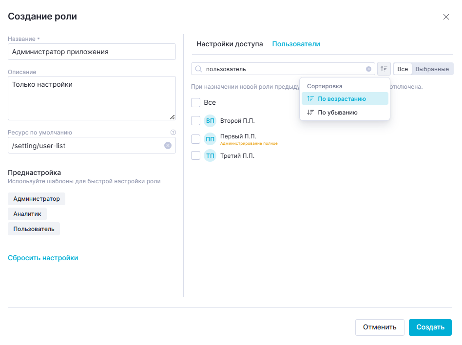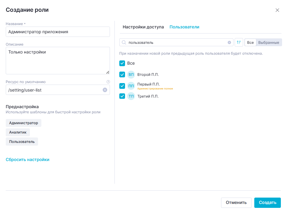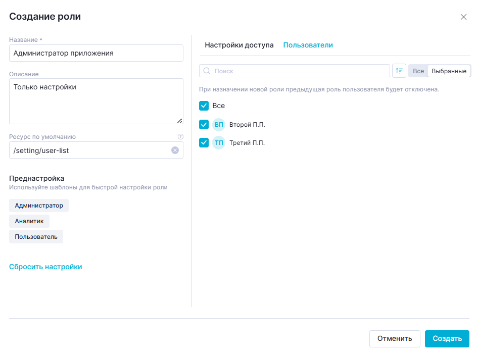 Для выбора пользователей, которых следует назначить для роли, необходимо установить чекбоксы рядом с тем или иным пользователем. Для присвоения создаваемой роли всем пользователям следует поставить флажок "Все".