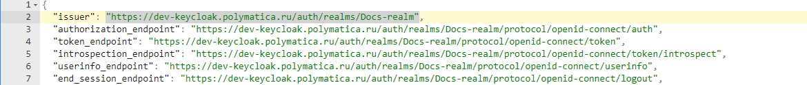 Кликаем внизу страницы ссылку OpenID Endpoint Configuration, чтобы открыть метаданные провайдера, в открывшейся вкладке браузера находим ключ "issuer" (обычно самый верхний после начала) и копируем значение, в нашем случае "https://dev-keycloak.polymatica.ru/auth/realms/Docs-realm".