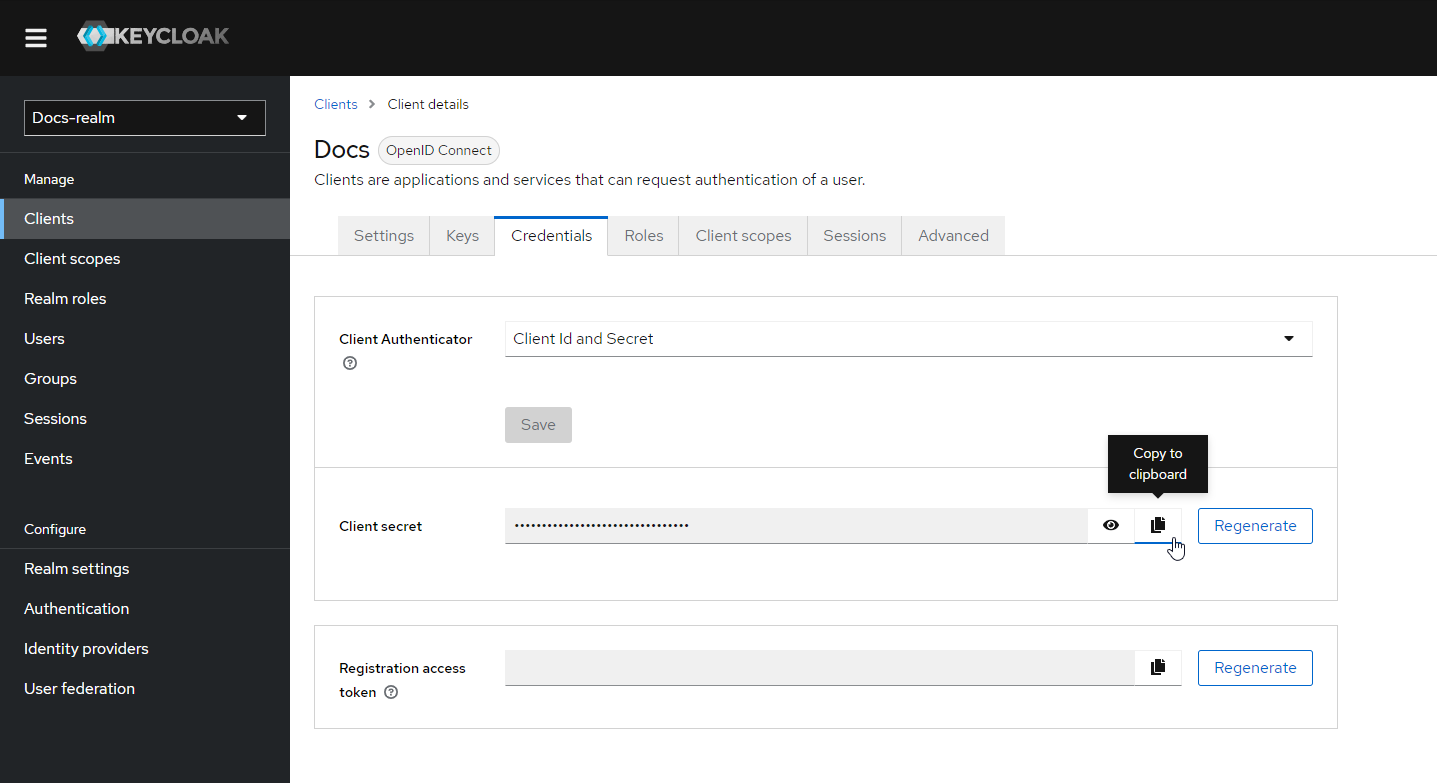Переходим на странице системы Docs в секцию Credentials. Находим поле Client secret и в правой его части кликаем кнопку Copy to clipboard. Сохраняем скопированное значение в файл, чтобы не потерять (например, в блокнот).