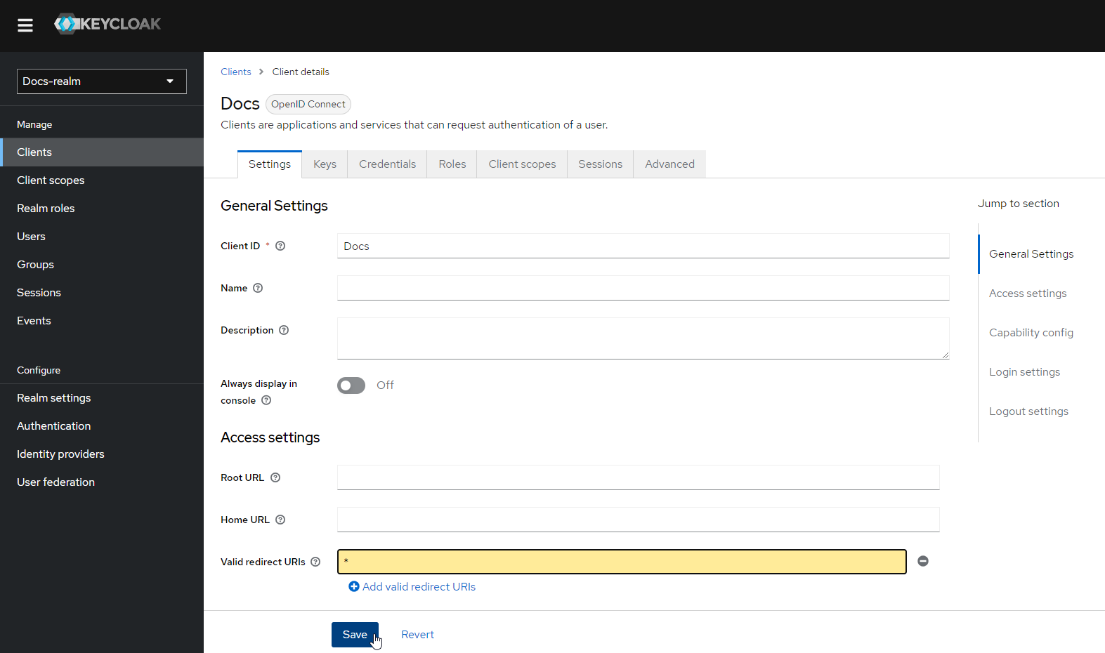 На странице системы Docs находим поле Valid redirect URIs. Так как мы используем тип клиента confidential, то адрес переадресации может быть любым: ставим символ «*», что означает – любое значение. Кликаем внизу кнопку Save.