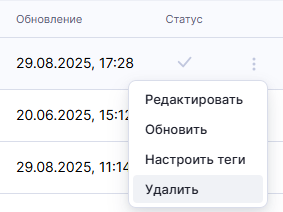Для удаления датасета из списка датасетов выберите в меню действий вариант «Удалить»: