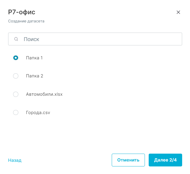 Чтобы создать датасет из источника «Р7-Офис», выберите источник соответствующего типа в окне выбора источника.