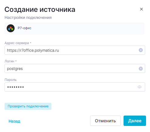 Для подключения к источнику в окне настройки подключения требуется указать параметры: