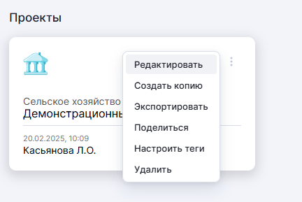 Для настройки какого-либо проекта следует нажать на кнопку на карточке проекта при карточном представлении списка проектов и выбрать вариант «Редактировать»: