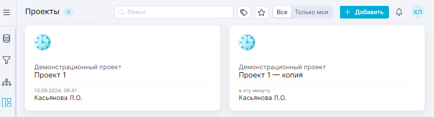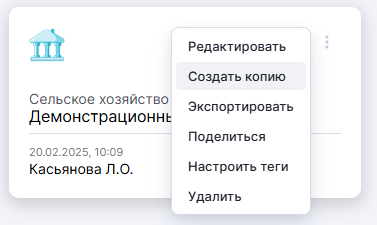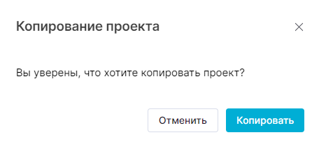 Для копирования проекта следует нажать на кнопку на карточке проекта при карточном представлении списка проектов и выбрать «Создать копию»: