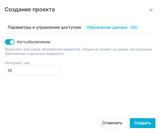Вкладка "Обновление данных" позволяет включить массовое динамическое обновление всех виджетов в проекте с определенной периодичностью, чтобы проект отражал актуальные данные.