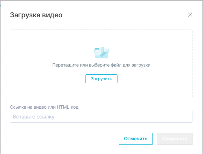 Для добавления видео в виде ссылки или кода следует ввести ссылку или код в соответствующее поле. После внесения ссылки или кода с видео окно для загрузки видео принимает следующий вид: