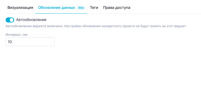 Вкладка "Обновление данных" позволяет включить динамическое обновление виджета в проекте с определенной периодичностью, чтобы он отражал актуальные данные.