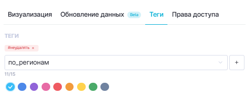 На вкладке Теги можно добавить информационные метки (теги) для отображения в реестре датасетов. Процедура добавления тегов аналогична описанной в разделе Работа с реестром → Управление тегами.