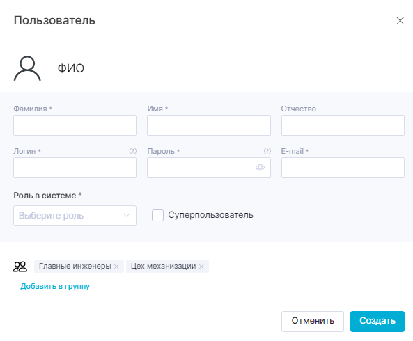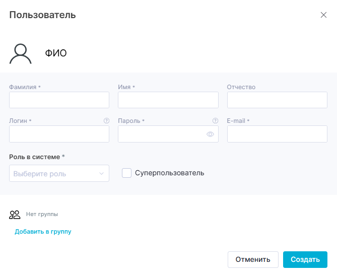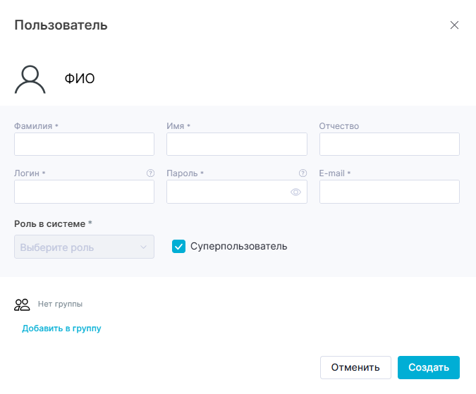 - Для обычного пользователя с правами ролевой модели «Доступ к пользователям» возможность установки флажка напротив «Суперпользователь» не предоставляется, данная опция не отображается.