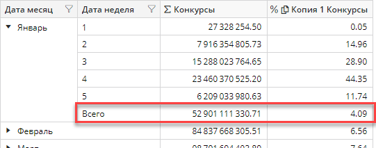 Рассмотрим пример, когда есть вложенные размерности. Если раскрыть элемент родительской размерности, то значение Всего факта Копия 1 Конкурсы вида Процент для вложенных элементов будет соответствовать значению данного факта для элемента родительской размерности Дата месяц, когда он был свернут. Так, на рисунке ниже, Всего для всех недель января равно 4.09, что представляет собой процентную долю января от общей суммы за год, то есть от 1 293 080 733 638.04. Значения для каждой недели января показаны от суммы конкурсов за январь, то есть от 52 901 111 330.71: