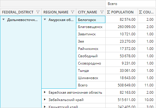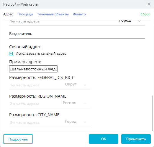 В настройках карты по каждой из размерностей (Округ, Регион, Город) должны быть заданы настройки части адреса. Необходимо установить флажок Использовать связный адрес. Далее указываются типы частей адреса: