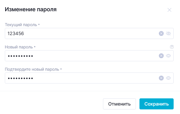Для отображения введенных текущего и нового пароля необходимо нажать на кнопку , расположенную в правых частях полей для ввода пароля. Для скрытия введенного пароля необходимо нажать на кнопку