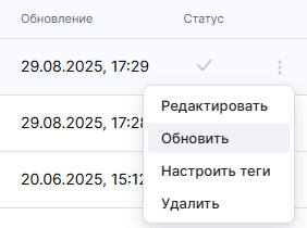 Чтобы запустить обновление, выберите в меню действий вариант "Обновить". Для настройки автоматического обновления см. Обновление датасета.