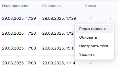 Для открытия окна с настройками датасета выберите в меню действий вариант "Редактировать". Подробнее о настройках датасета см. Настройка датасета.