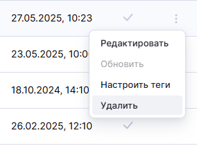 Для удаления датасета из списка датасетов выберите в меню действий вариант "Удалить":