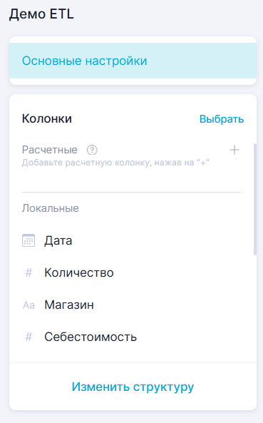 Заданную при создании структуру ETL-датасета также можно изменить. Для этого необходимо нажать на кнопку "Изменить структуру" в блоке "Колонки" в настройках датасета.