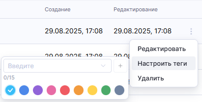 Для настройки тегов к шаблону фильтра выберите в меню действий вариант "Настроить теги". После выбора опции появляется еще один уровень выпадающего меню, в котором можно добавить теги. Процедура добавления тегов описана в разделе Работа с реестром - Управление тегами.