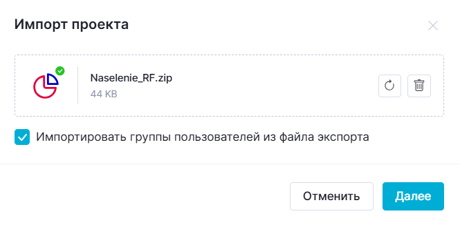* Данные датасетов не сохраняются экспортом. После импорта проекта, для затронутых импортом (созданных или измененных) датасетов необходимо выполнять восстановление данных.
