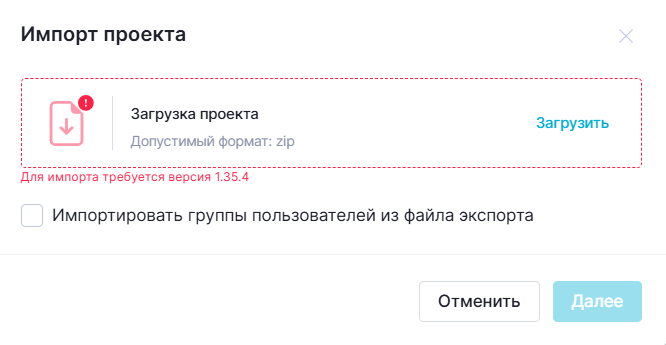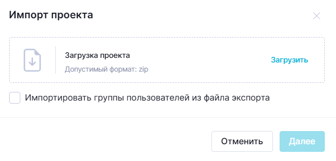 4. В открывшемся модальном окне "Импорт проекта" нажмите на кнопку "Загрузить". Выберите файл экспорта.