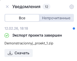 4. Когда файл экспорта сформирован, поступает соответствующее уведомление. Откройте окно уведомлений, найдите уведомление "Экспорт проекта завершен" и нажмите в нем кнопку "Скачать".