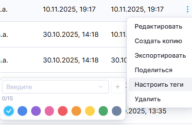 Или настроить теги к проекту можно, нажав на кнопку у какого-либо проекта в списке при табличном представлении списка проектов и выбрав "Настроить теги":