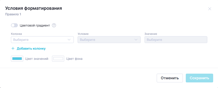 После нажатия на кнопку добавится блок для выбора колонки и указания условия для этой колонки. Данный блок можно добавлять неограниченное количество раз. - Настройка цвета значений.
