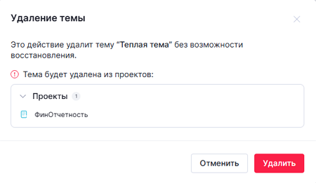 После нажатия на кнопку появляется окно подтверждения удаления с предупреждением о связанных проектах: