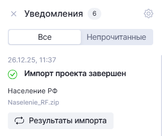 8. В уведомления системы поступит уведомление об импорте либо ошибке импорта проекта. Уведомление об импорте содержит кнопку "Результаты импорта", при нажатии на которую открывается окно сведений о замененных или добавленных сущностях.