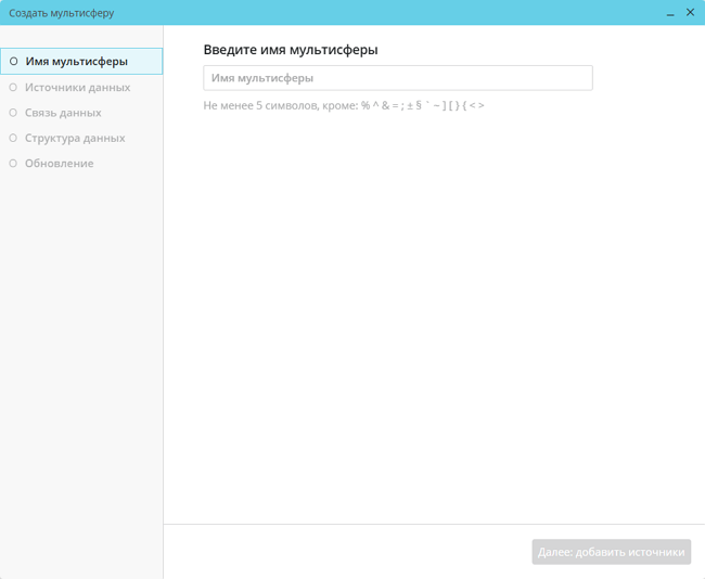 После нажатия откроется окно создания мультисферы, состоящее из пяти последовательно заполняемых вкладок: «Имя мультисферы», «Источники данных», «Связь данных», «Структура данных», «Обновление»: