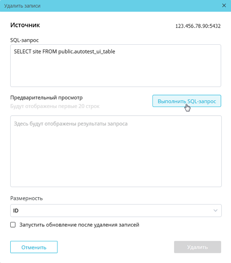 В окне отображается адрес источника данных, содержится поле «SQL-запрос», кнопка «Выполнить SQL-запрос», область для предварительного просмотра результатов запроса, поле «Размерность» с выпадающим списком значений, чекбокс «Запустить обновление после удаления записей», а также кнопки «Отменить» и «Удалить».