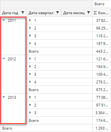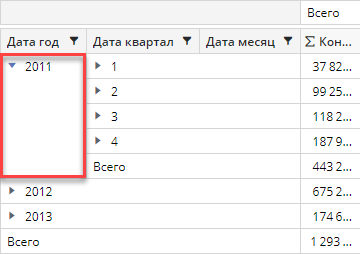 - Уровень 0 — уровень Размерности 0. На уровне представлены элементы первой вынесенной размерности с учетом всех активных фильтров. Если элемент размерности раскрыт, то значения по этому элементу будут отображены в строке «Всего» на уровне Размерности 1. Если элемент размерности не раскрыт, то данные по элементу будут отображены в его строке.