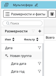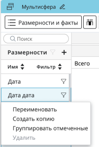 Группировать отмеченные (активна только для отмеченных размерностей в панели) – добавляет отмеченные размерности в группу. После нажатия на пункт меню будет предложен ввод названия группы, а по нажатию на Enter будет отправлен запрос на создание группы с введенным именем.
