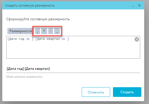 Разделители исходных размерностейПри необходимости укажите имя составной размерности. Имя составной размерности должно быть уникальным в пределах мультисферы. Если имя составной размерности не задано, оно будет сформировано автоматически: